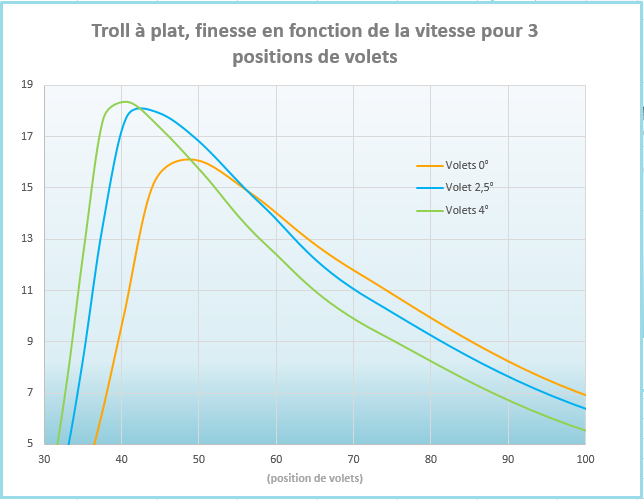 TrollSB-5-FinesseFonctionVitesseVSvolets Previous Publié 23 novembre 2017 à 644 × 500 dans Voltige et pilotage 4 axes Finesse max avec 4° de volets (courbe verte) oui ! Mais… au delà de ~43km/h on est plus fin avec 2,5° de volets (courbe bleue), au delà de ~56km/h on est plus fin en lisse (courbe orange).