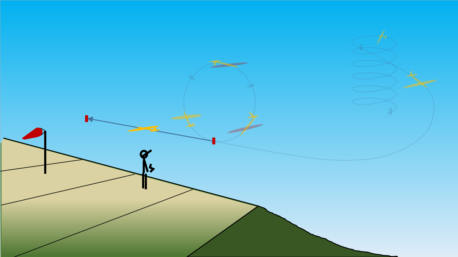 7 palier en sortie de boucle : à la profondeur, on pousse très légèrement pour maintenir sa vitesse et le palier. Et suivant la vitesse de sortie de boucle, on utilisera ou non des volets : faible vitesse, quelques degrés de volets. Vitesse élevée, profil lisse. On perçoit ici comme dans l’étape 3 l’intêret du 4 axes, alors que dans la boucle (étapes 4, 5, 6) le snap-flap est un outil suffisant.