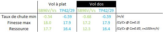 J’ai stocké les valeurs de ces 3 indicateurs (2 fois, sur le ventre et sur le dos !), en cherchant le meilleur angle de volet, pour le Troll avec SB96V et avec TP42 :