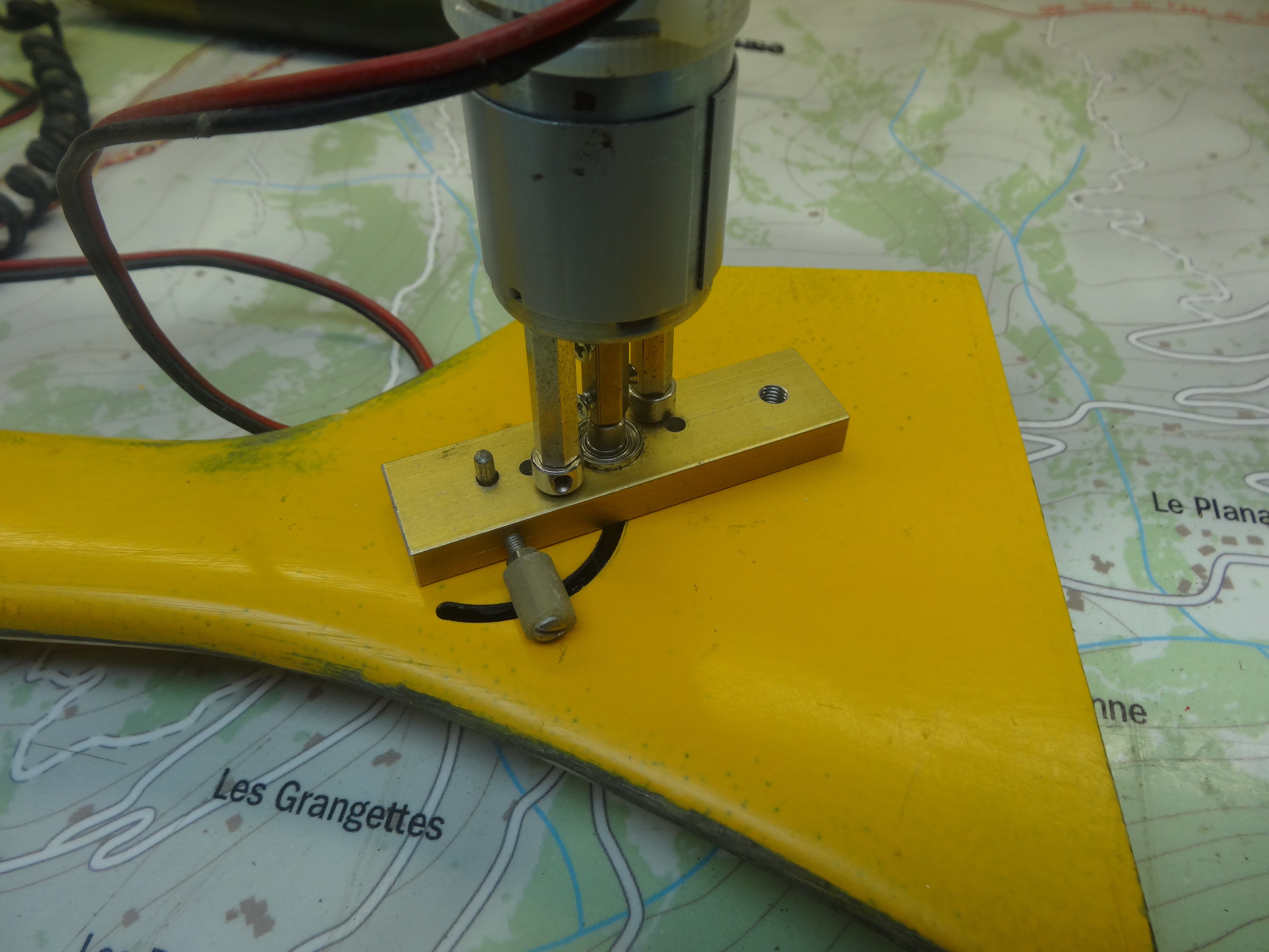 La photo montre l’outil de positionnement horizontal de l’articulation de stabilisateur. Cet outil est utilisable sur différents planeurs. Au-dessus la fraise pour découper l’ouverture en arc de cercle de façon symétrique et précise.