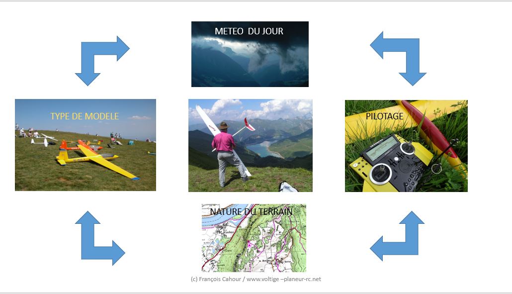 Cette compréhension s’effectue aussi à l’aide du modèle, qui en vol reste le meilleur moyen de détecter les ascendances. Donc avant de lancer, chercher les zones les plus favorables et après avoir lancé, apprendre à bien détecter puis exploiter les ascendances probables.