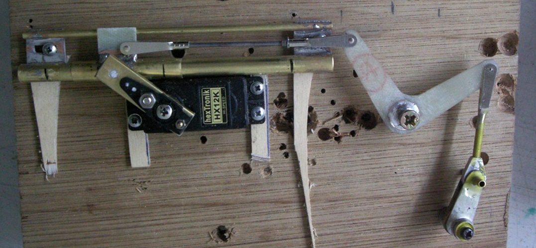 Pour résumer : la solution choisie à ce moment consistait pour moi à transmettre à l’aide d’un câble A.R., le mouvement rotatif du servo matérialisé sur un tambour vers un guignol de rayon adapté.