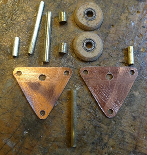 Ici un ensemble de pièces utilisées sur un Quartz ou un Sylphe. Le guignol de profondeur et la poulie du servo sont ici taillés dans du ctp 2mm. Le renvoi à 90° est constitué de de deux roulements à bille montés sur un tube laiton entre 3 flasques circulaires.