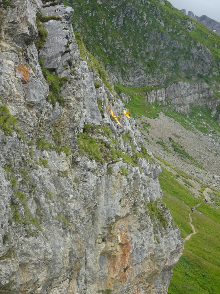 Après un atterrissage loupé, provoqué par le flutter de dérive, il a fallu récupérer le planeur fiché dans la falaise du site de l’Aiguille de Roselette.