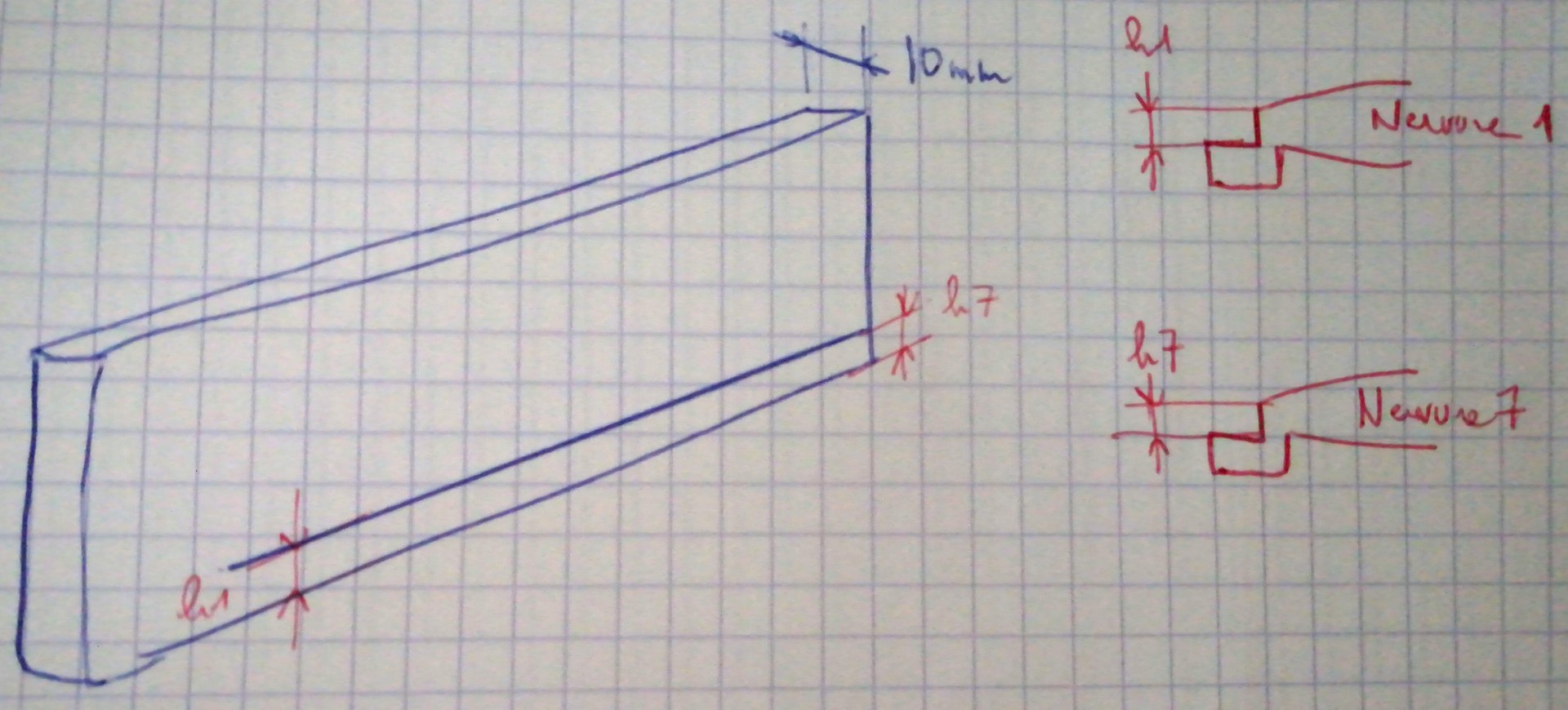 Donc pour préparer mon BA pour les N1 à N7, je mesure la hauteur h1 sur la nervure 1, la hauteur h7 sur la nervure 7, et dans une planche de 10mm je taille à la règle et au cutter une baguette dégressive, 30 ou 50mm plus longue que nécessaire.