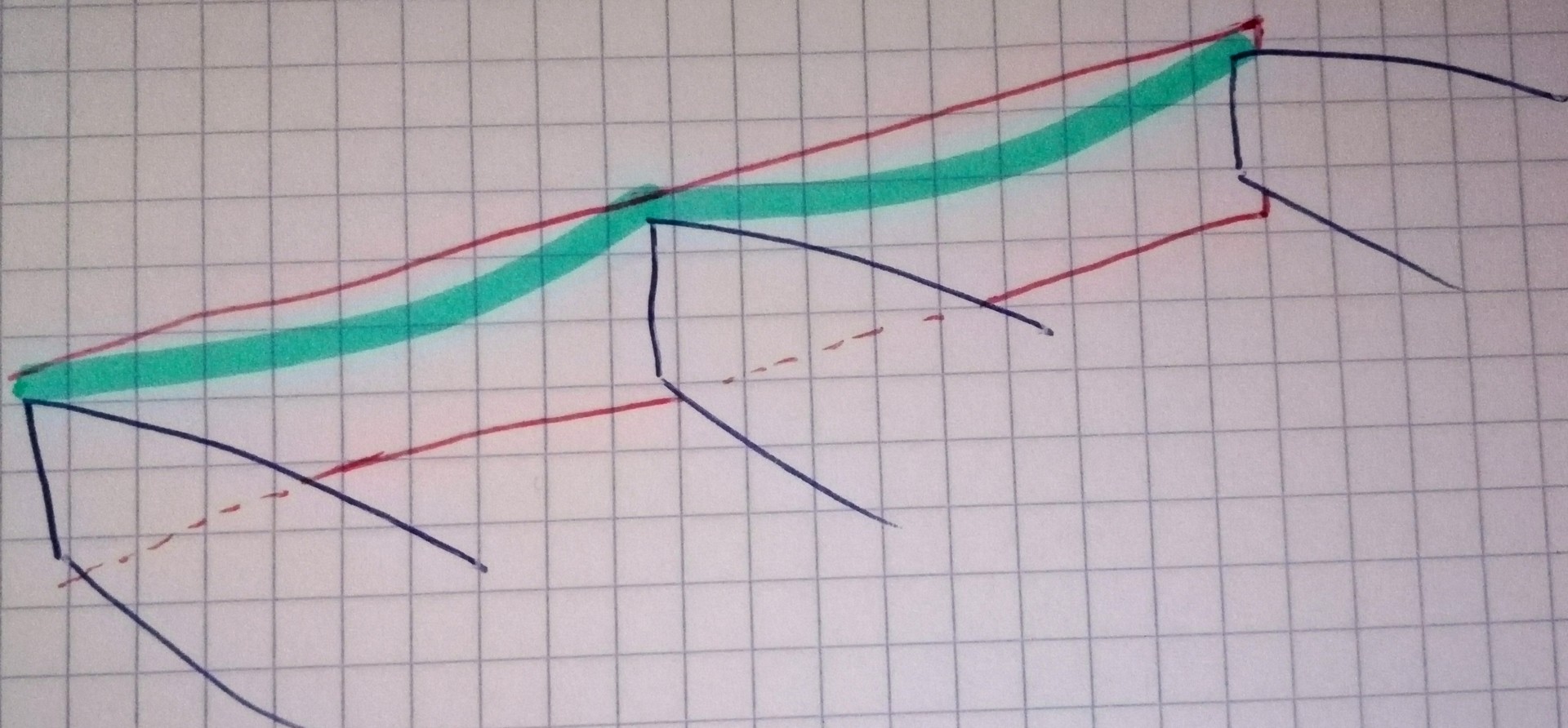 Mais comme il s’agit de balsa 1.5mm donc très souple, et que le BA est plutôt profond (10mm puis 6mm) et donc remonte assez la nervure pour ne pas tomber sur un angle trop fort par rapport à l’horizontale (rose ci-dessous) j’ai trouvé que les avantages l’emportaient sur les inconvénients.
